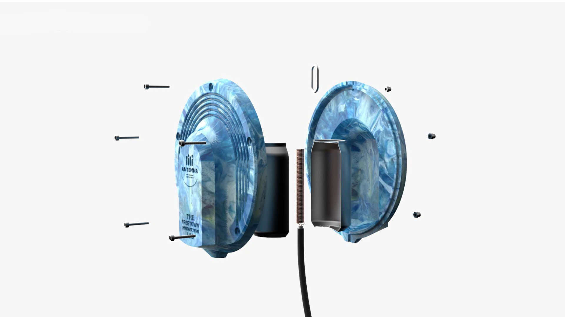 The LILI ANTENNA is made from 90% waste materials, with its outer casing made from recycled plastic and the inner technology using recycled aluminum cans, contributing to environmental conservation, while delivering news, entertainment, and access to information to everyone.